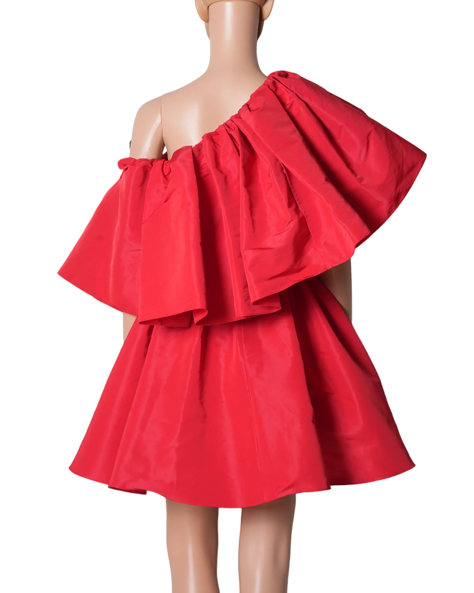 This single shoulder mini dress has a beautiful statement ruffle detailing & a back zip with the hook & button closure