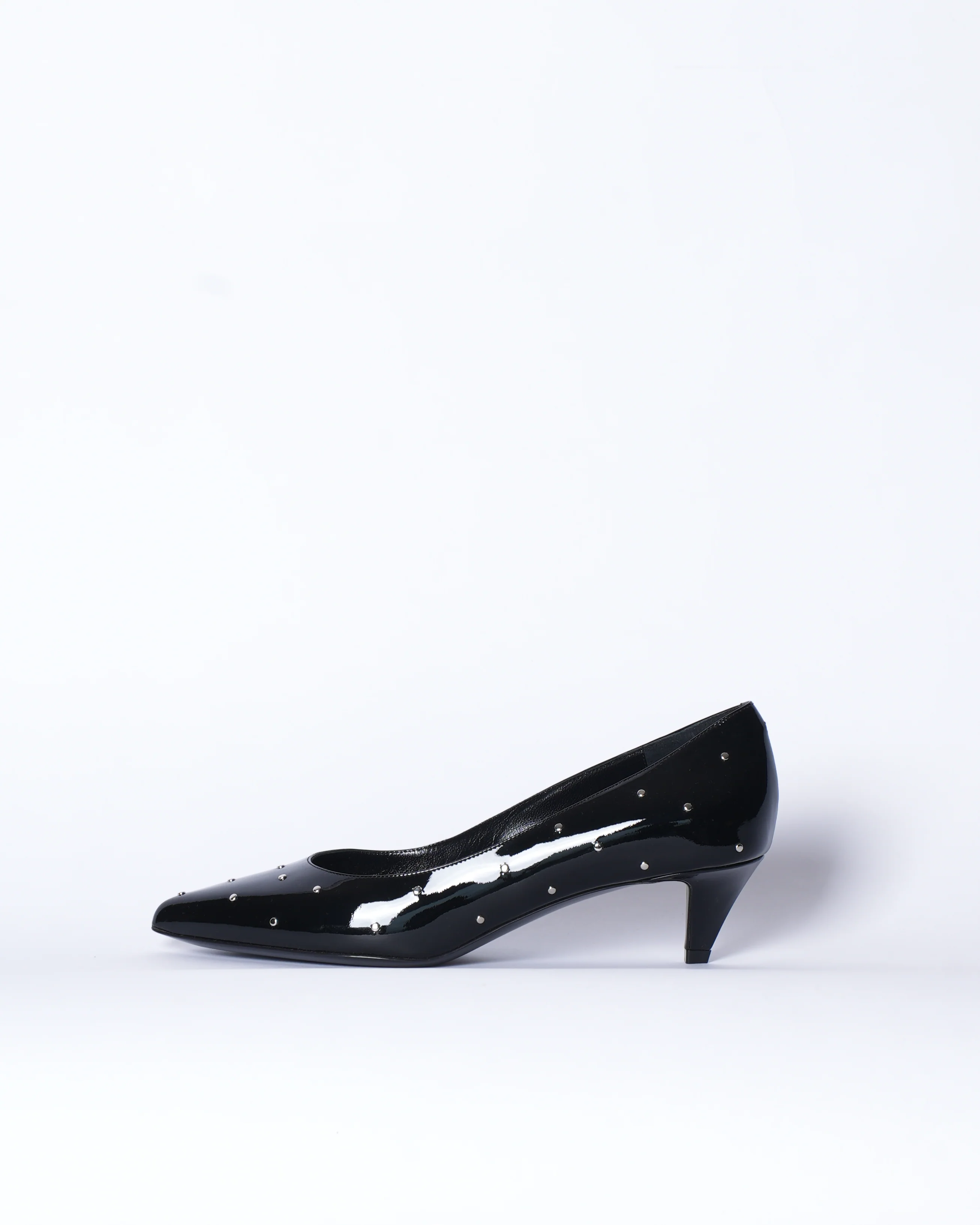 Crafted in black patent leather, these shoes feature silver-toned studding and pointy toes. They have a slip-on style for easy wear and are fully lined in black with a lightly padded insole for comfort. The low kitten heel adds a touch of elegance.