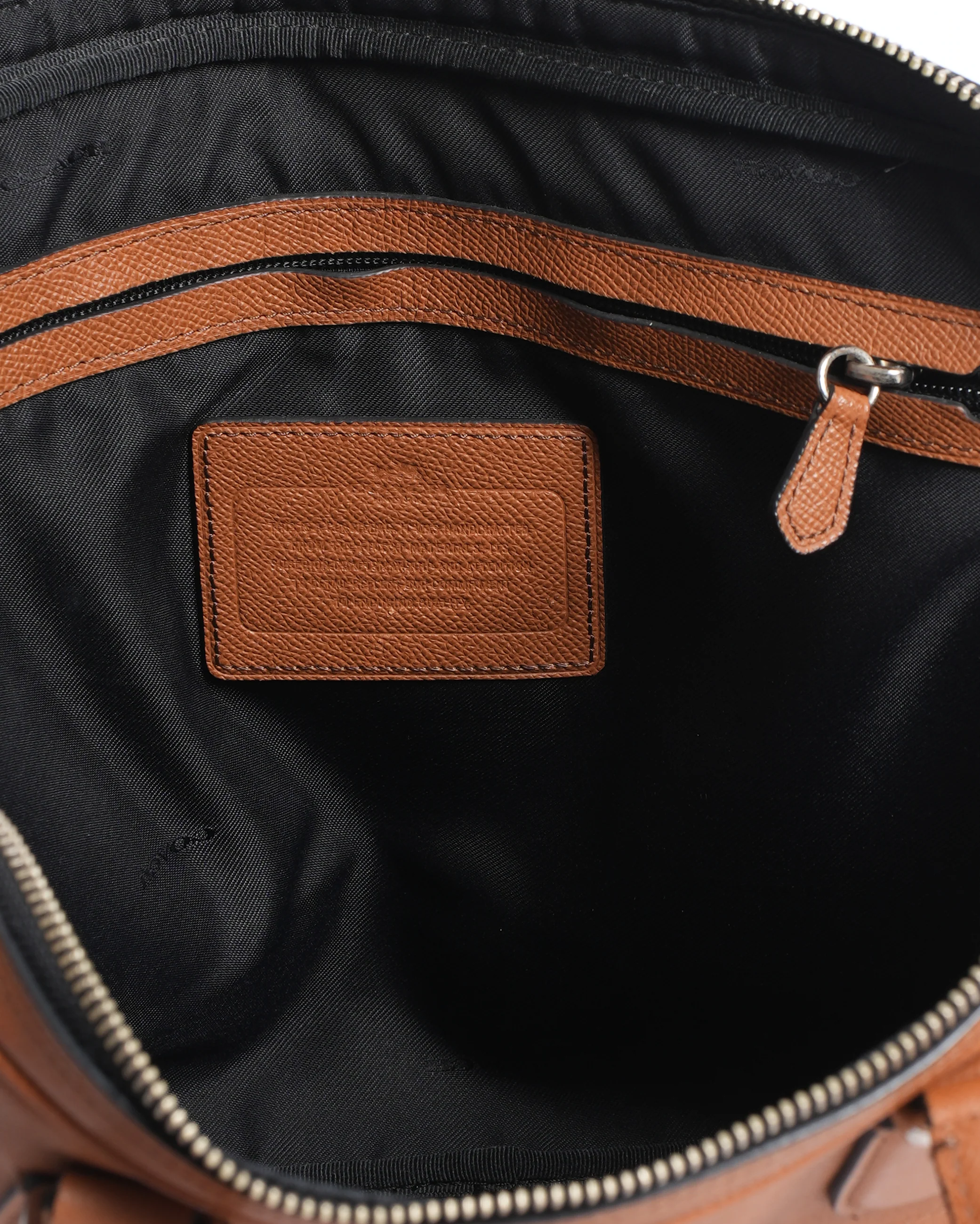 Coach Kennedy Brief Bag. This versatile briefcase is crafted from leather in a rich brown, offering a refined yet practical design. It features comfortable top handles and shoulder strap, a spacious main compartment with a secure zip-top closure, and a convenient front zippered pocket for easy access to your belongings. The discreet Coach logo and hanging leather tag add a touch of signature elegance.