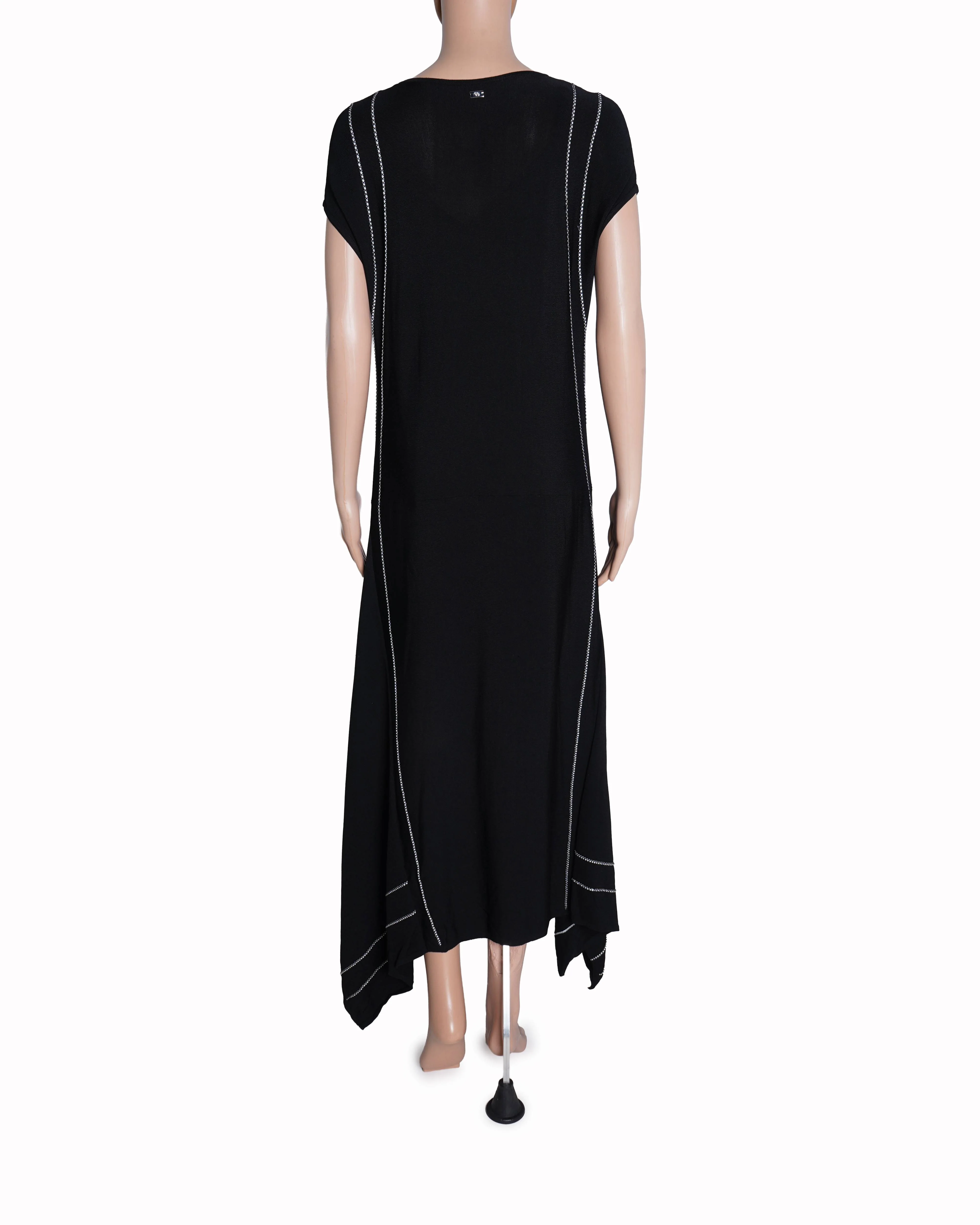 Escada Women's Black Dress is a sophisticated example of modern tailoring, blending a minimalist aesthetic with unique structural details. This midi-length garment is rendered in a deep black hue, offering a versatile foundation for both professional and evening wardrobes. A standout design element is the delicate white contrast topstitching or piping that traces the vertical seams of the bodice and defines the hem of the flared sections.