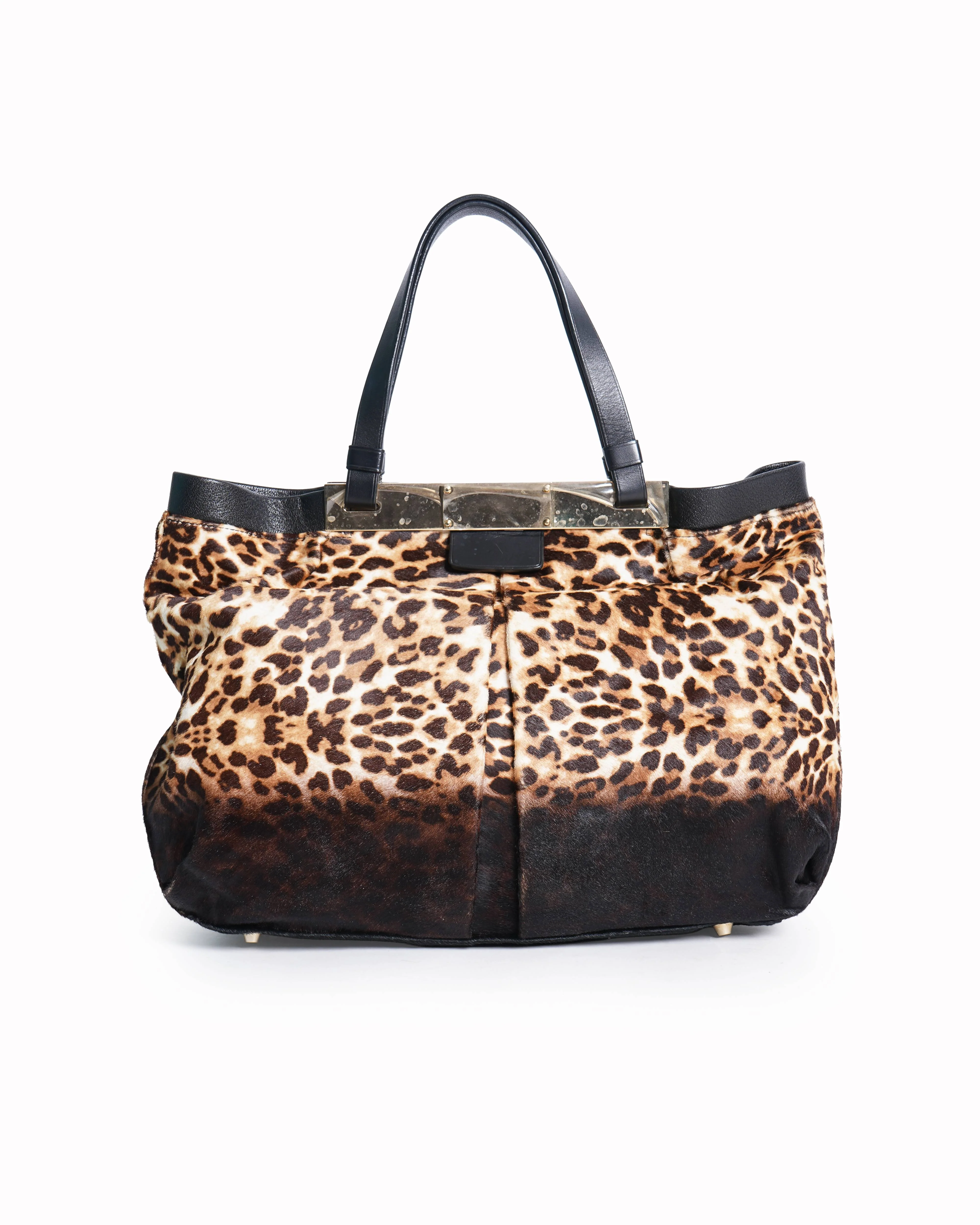 Jimmy Choo Leopard Print Hair Bag is a bold and luxurious statement piece that combines exotic textures with a relaxed, slouchy silhouette. This eye-catching shoulder bag is rendered in premium leopard-print calfskin hair, featuring a rich gradient that fades from a vibrant animal pattern at the top to a deep, solid espresso brown at the base. The design is defined by its polished gold-tone hardware, including a structured metallic top frame and a decorative front strap finished with a delicate key charm.