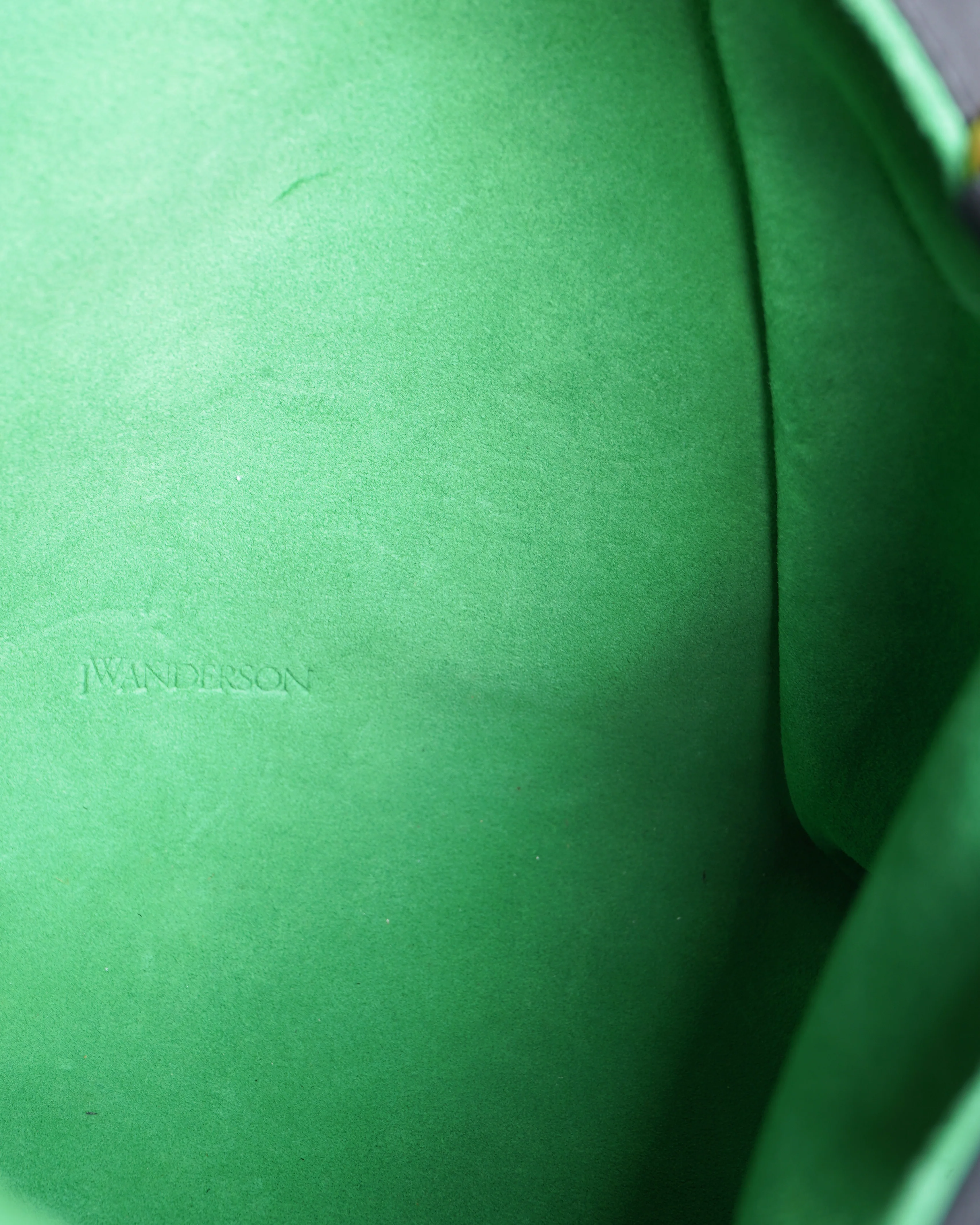 JW Anderson Lambskin Chain Closure Pochette is a modern and sculptural accessory that highlights the brand's penchant for bold, oversized hardware. This versatile bag is rendered in buttery-soft black lambskin leather, featuring a vibrant lime green interior lining that provides a striking pop of color. The design is defined by its signature oversized gold-tone closure at the top, which serves as both a secure fastening and a statement decorative element.