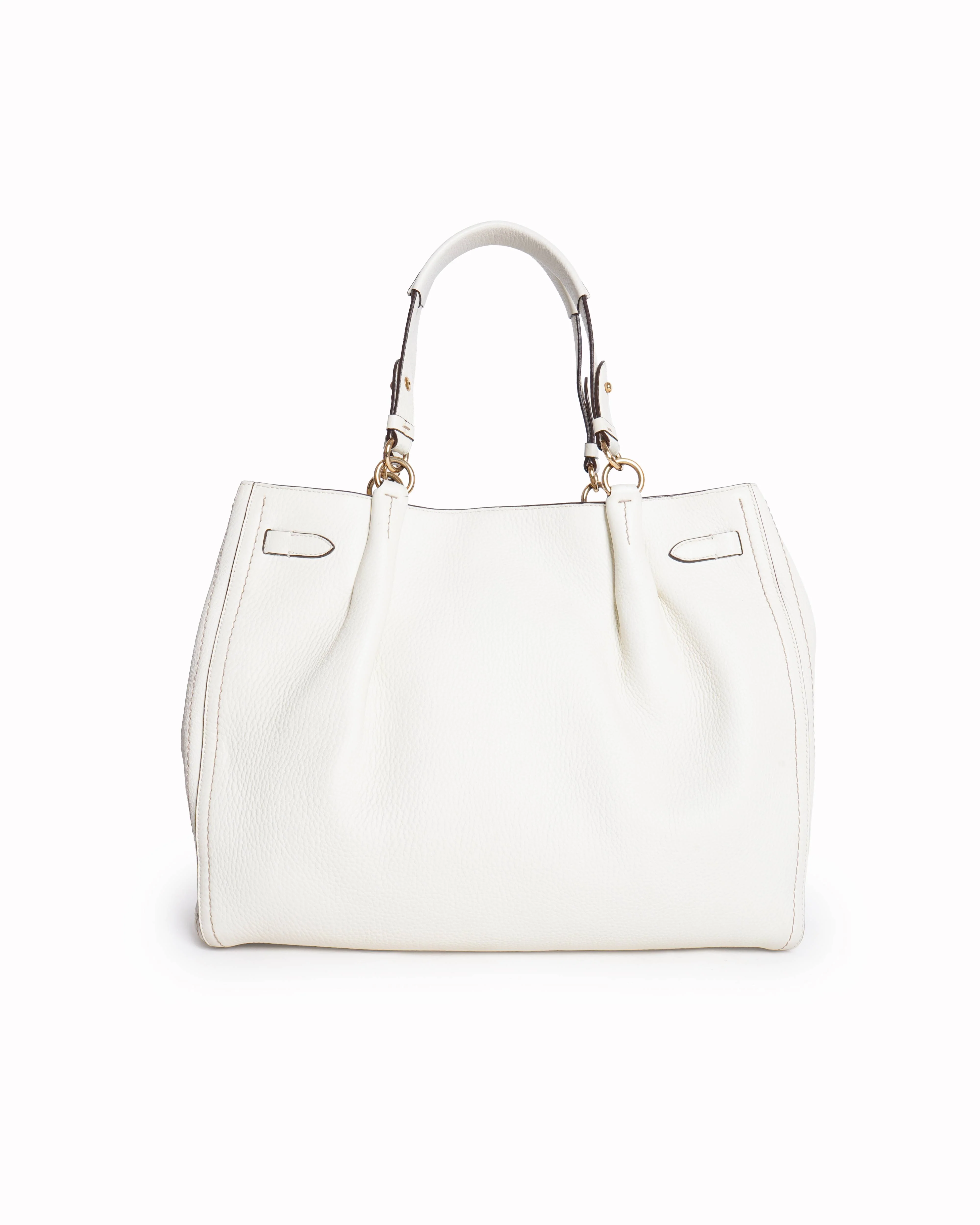 Salvatore Ferragamo White Tote Bag is a sophisticated and highly functional accessory that epitomizes the brand's commitment to Italian luxury and timeless design. This bag is rendered in a white pebbled leather.The design is defined by its spacious, structured silhouette and is elegantly finished with a gold-tone Gancini flip-lock closure on the front, accented by dual rolled leather top handles with polished gold-finish hardware.